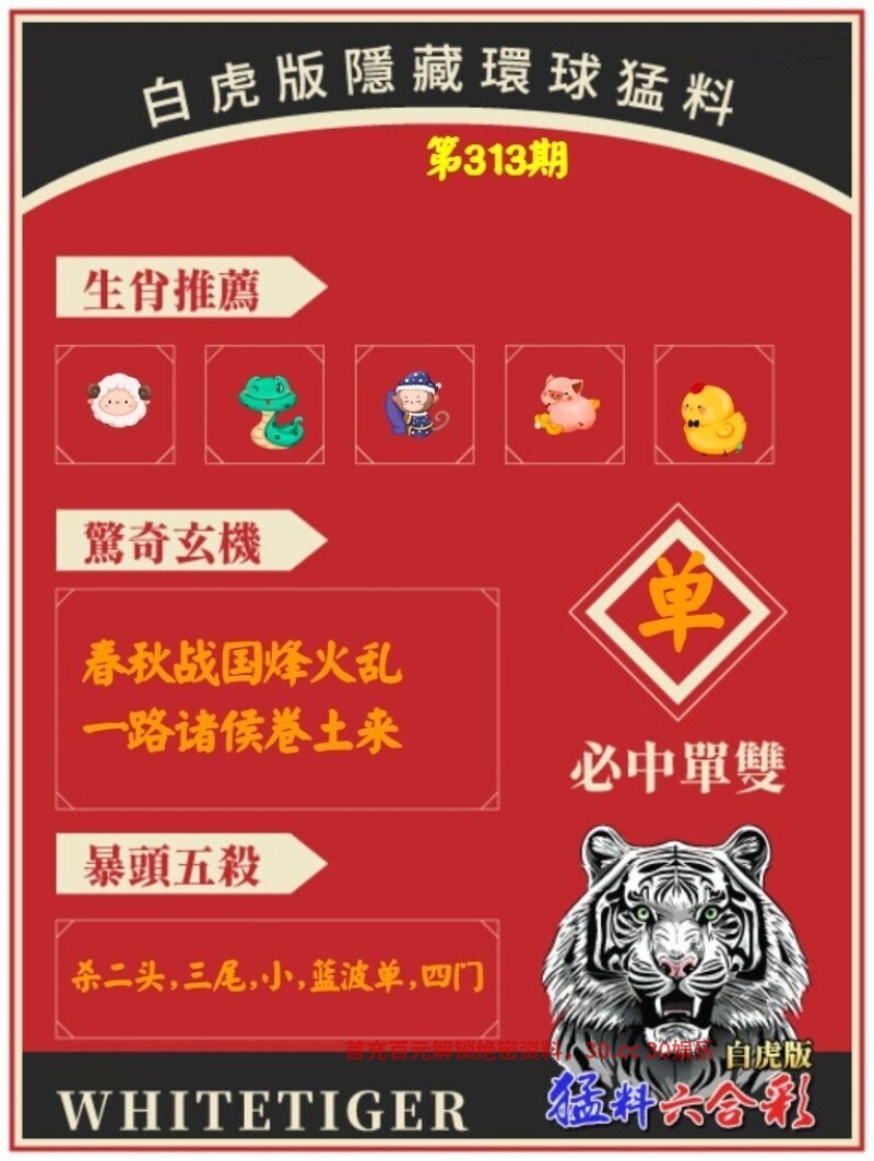 313期:白虎环球猛料 开:龙38对 春秋战国烽火乱,一路诸侯卷土来 解释:春秋战国烽火乱,一路诸侯卷土来,解蛇猪虎鸡 九肖:蛇猪虎鸡马羊龙狗牛 |